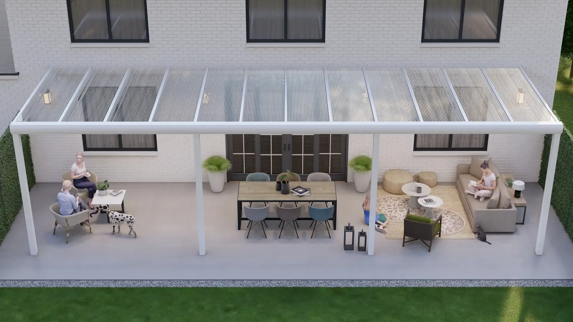 Diese Garten Vista Terrassenüberdachung mit Polycarbonatdach in der Farbe Mattweiß, mit einer Breite von 12,03 Metern und einer Tiefe von 4,5 Metern, wird von 4 Pfosten getragen. Die Pfosten haben eine Standardlänge von 2,7 Metern.