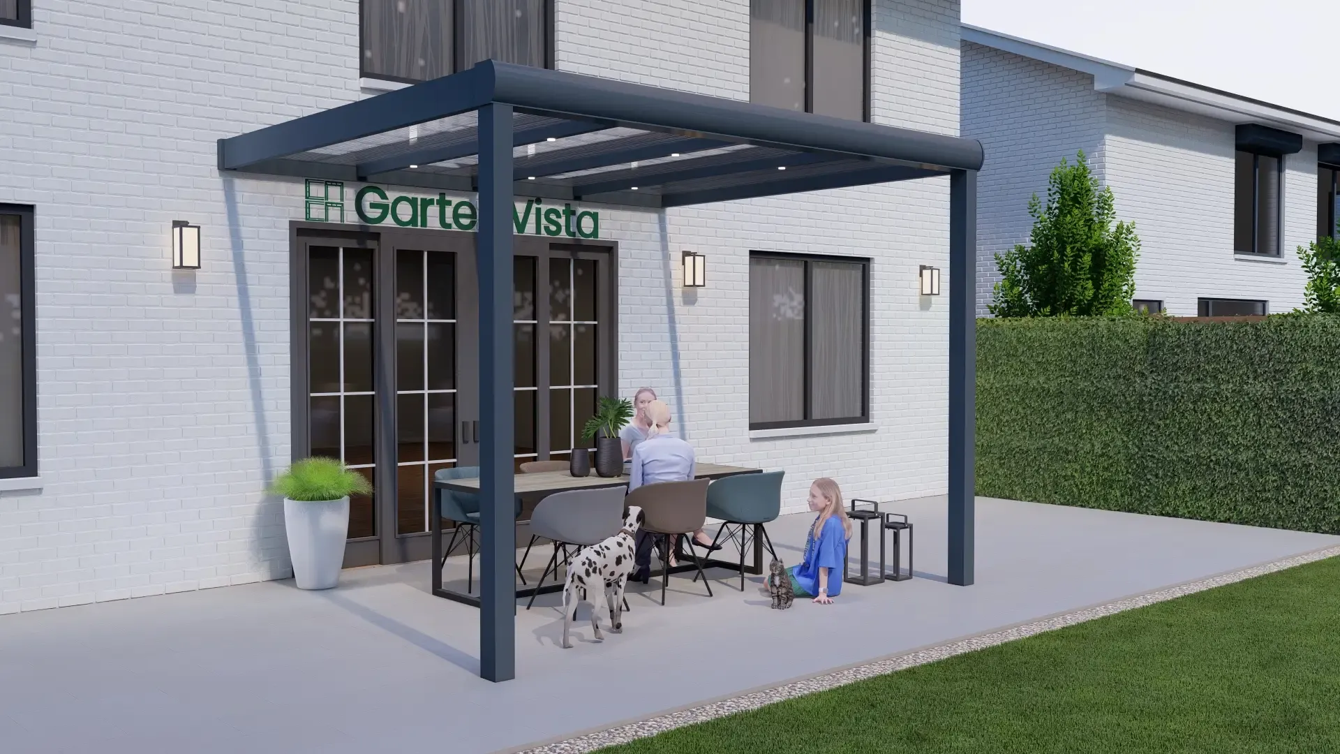Die Überdachung ist modular aufgebaut und jederzeit erweiterbar, zum Beispiel mit:- Glasschiebewänden